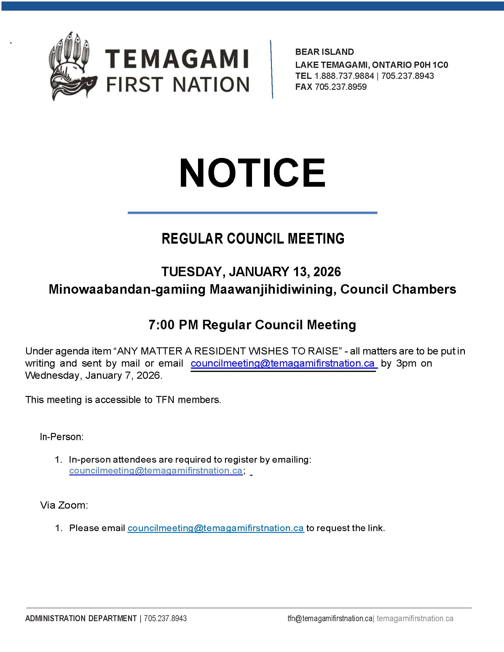 The Next Regular Chief & Council Meeting January 13, 2026